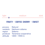 Deze ongewassen (Natural) Ethiopia komt uit één van de meest gerenommeerde streken uit Ethiopia, Sidama, en wordt geteeld door de Taramesa coöperatieve die bekend staat voor zijn 'natural' proces dat een milde, zoete en fruitige koffie oplevert, met intense toetsen van koffiebes en rood fruit.